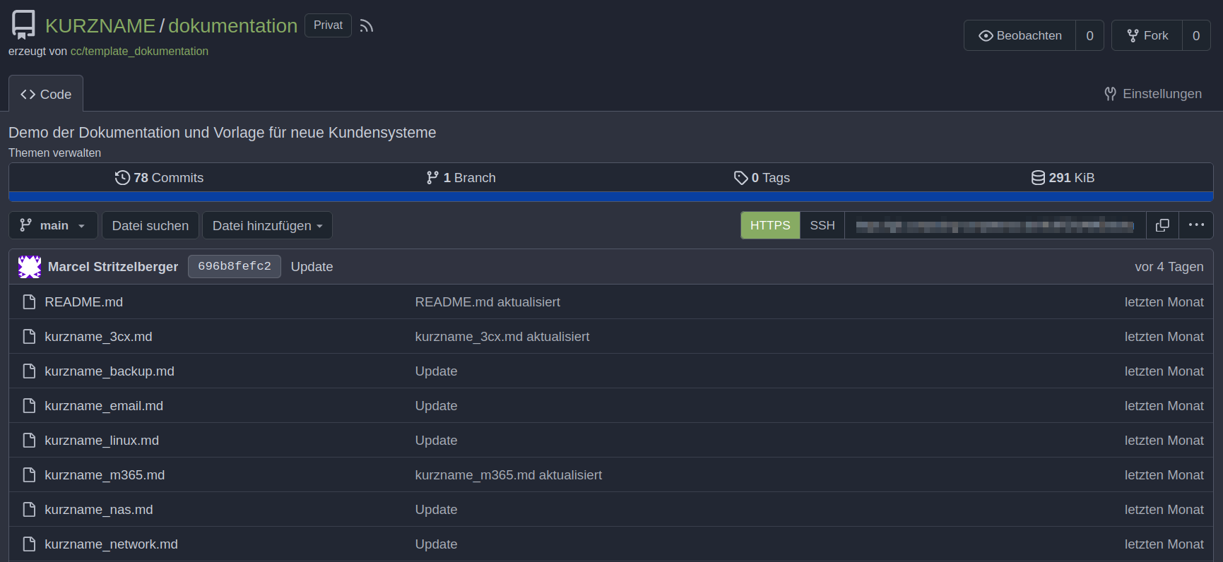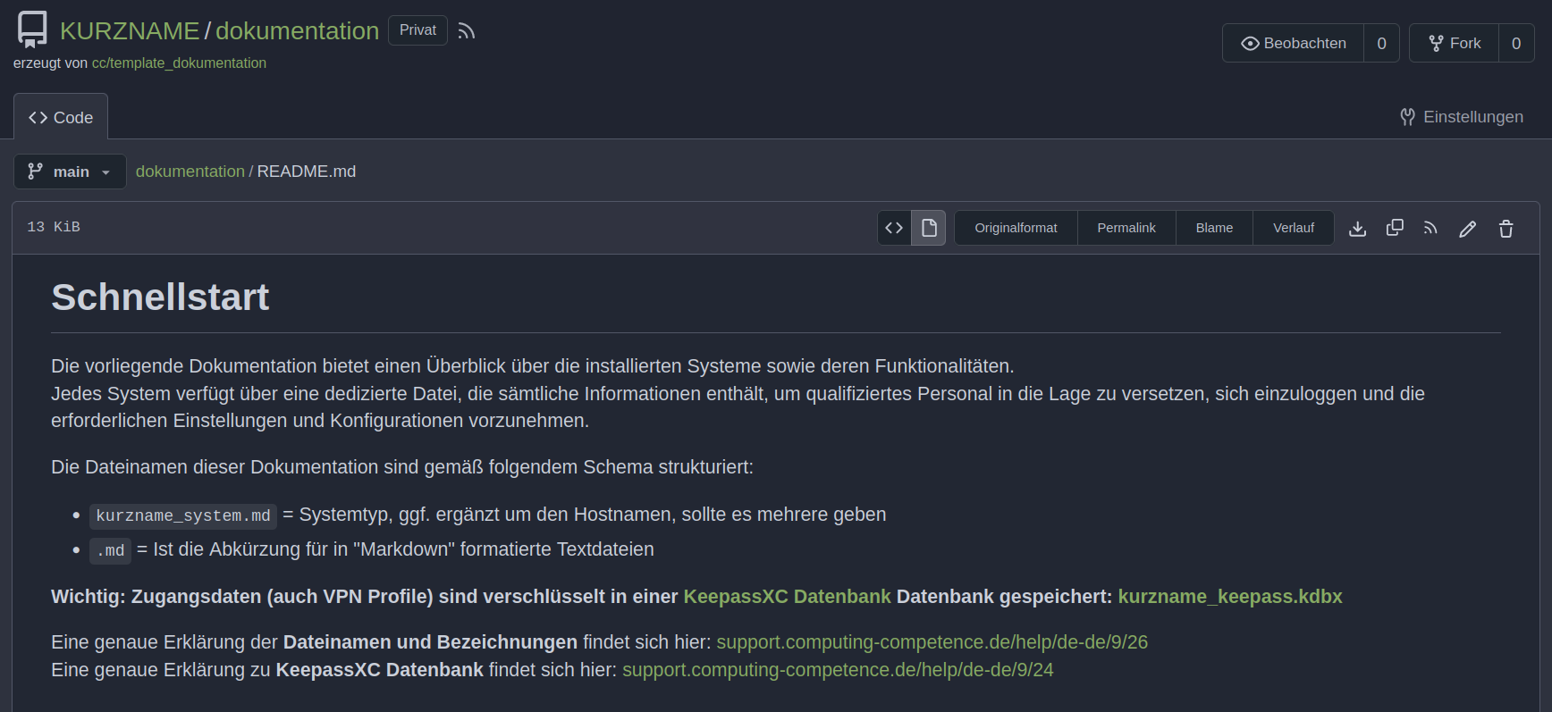 Die Dokumentation wird mithilfe einer (GIT) Versionskontrolle nachvollziehbar aufgebaut und gepflegt. In Bezug auf die Verwaltung von Zugangsdaten legen wir besonderen Wert darauf, diese getrennt und verschlüsselt zu handhaben, um die Sicherheit sensibler Informationen zu gewährleisten.